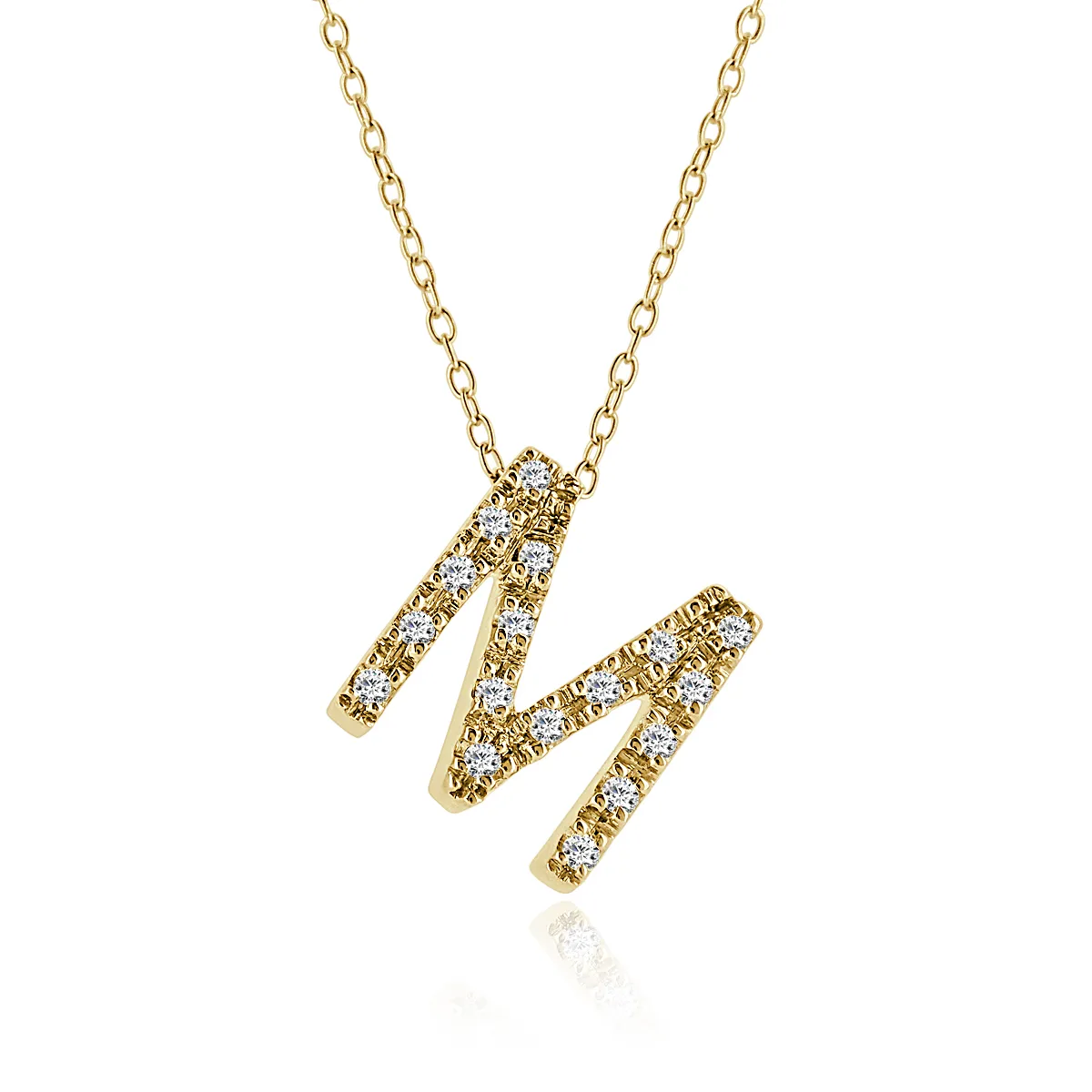 Collar modelo MY NAME realizado en oro amarillo primera ley. Colgante 10 mm letra M con 17 diamantes blancos talla brillante peso total 0,08 quilates, color G y pureza VS2 + cadena forsat 42 cm