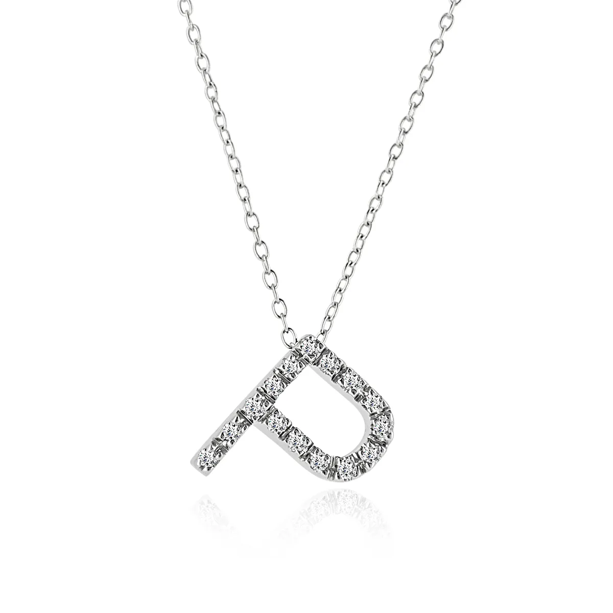 Collar modelo MY NAME realizado en oro blanco primera ley. Colgante 10 mm letra P con 15 diamantes blancos talla brillante peso total 0,07 quilates, color G y pureza VS2 + cadena forsat 42 cm